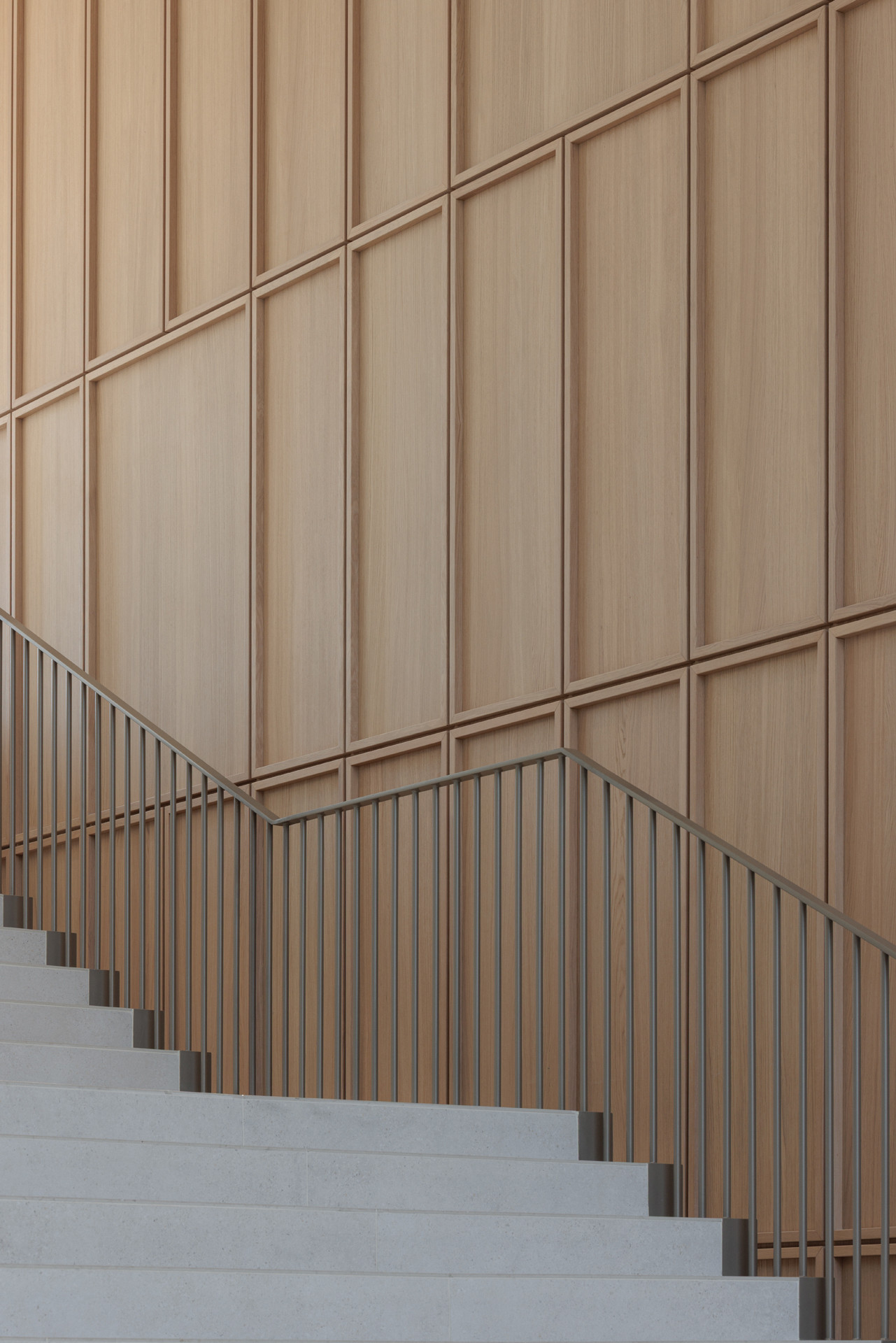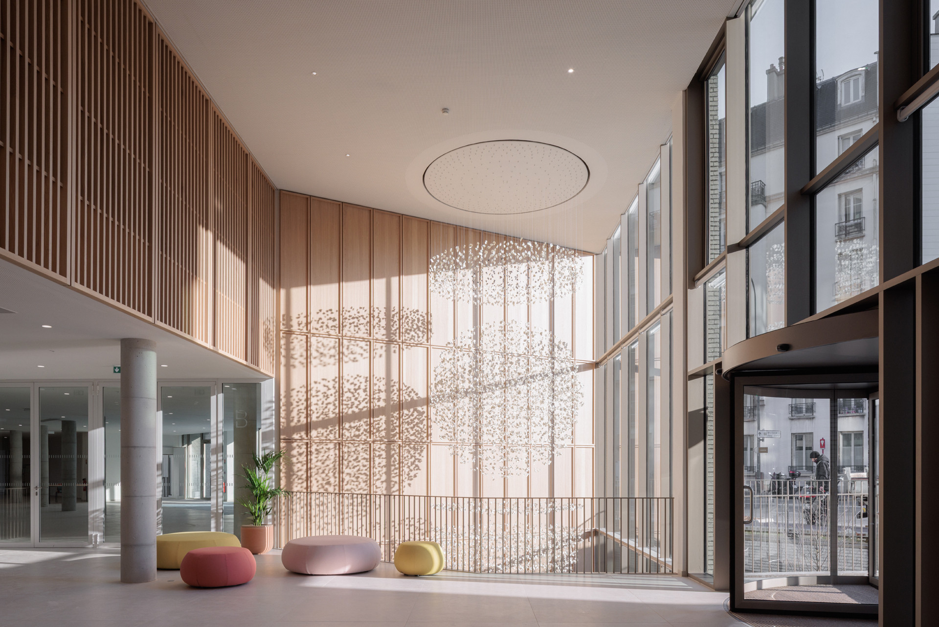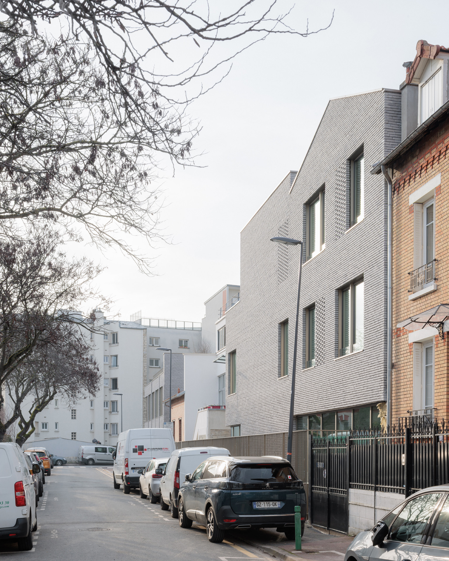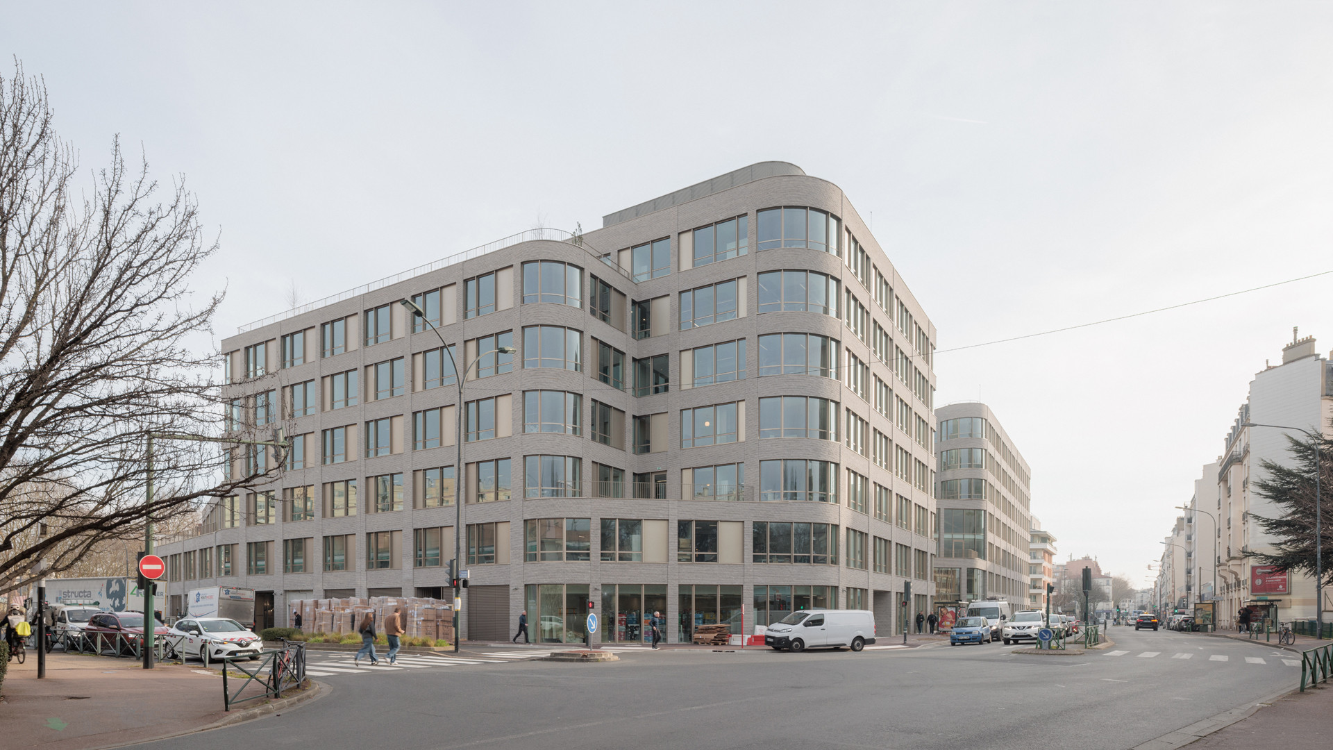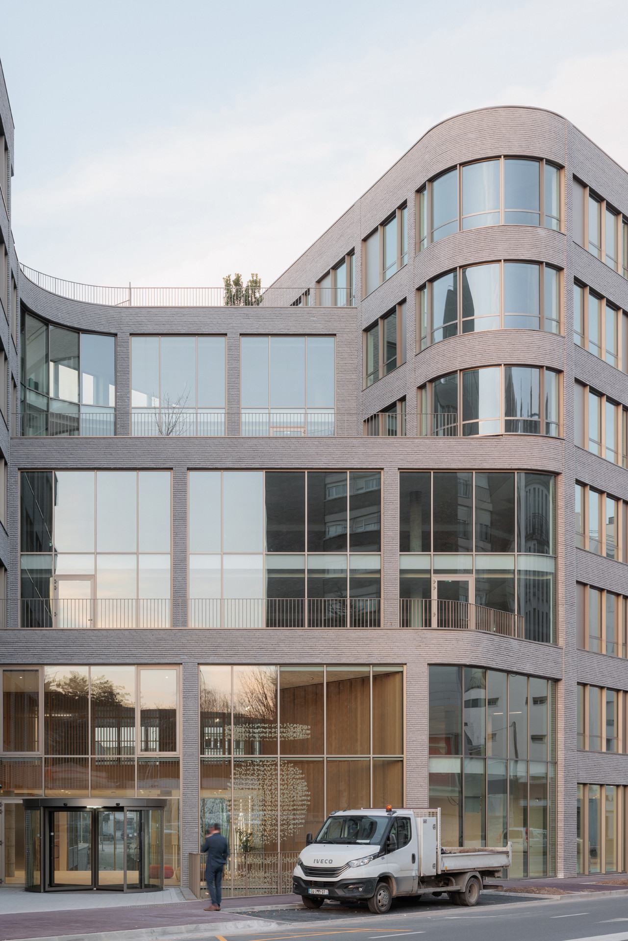 La maîtrise d’œuvre a souhaité voir émerger un monolithe de brique, dont les calepinages en diagonales ininterrompues rappellent les quinconces des larges baies et les terrasses en escalier. Les architectes ont étudié un épannelage courtois, entre la grande échelle urbaine et les pavillons voisins dont le matériau a inspiré le projet. Transition d’échelle souvent acrobatique pour un programme de bureaux. Ils ont imaginé pour ces lieux de travail des espaces extérieurs généreusement végétalisés, qui « couleraient » sur les façades, plongeant dans un jardin escarpé tout aussi luxuriant et protégé de l’avenue passante.