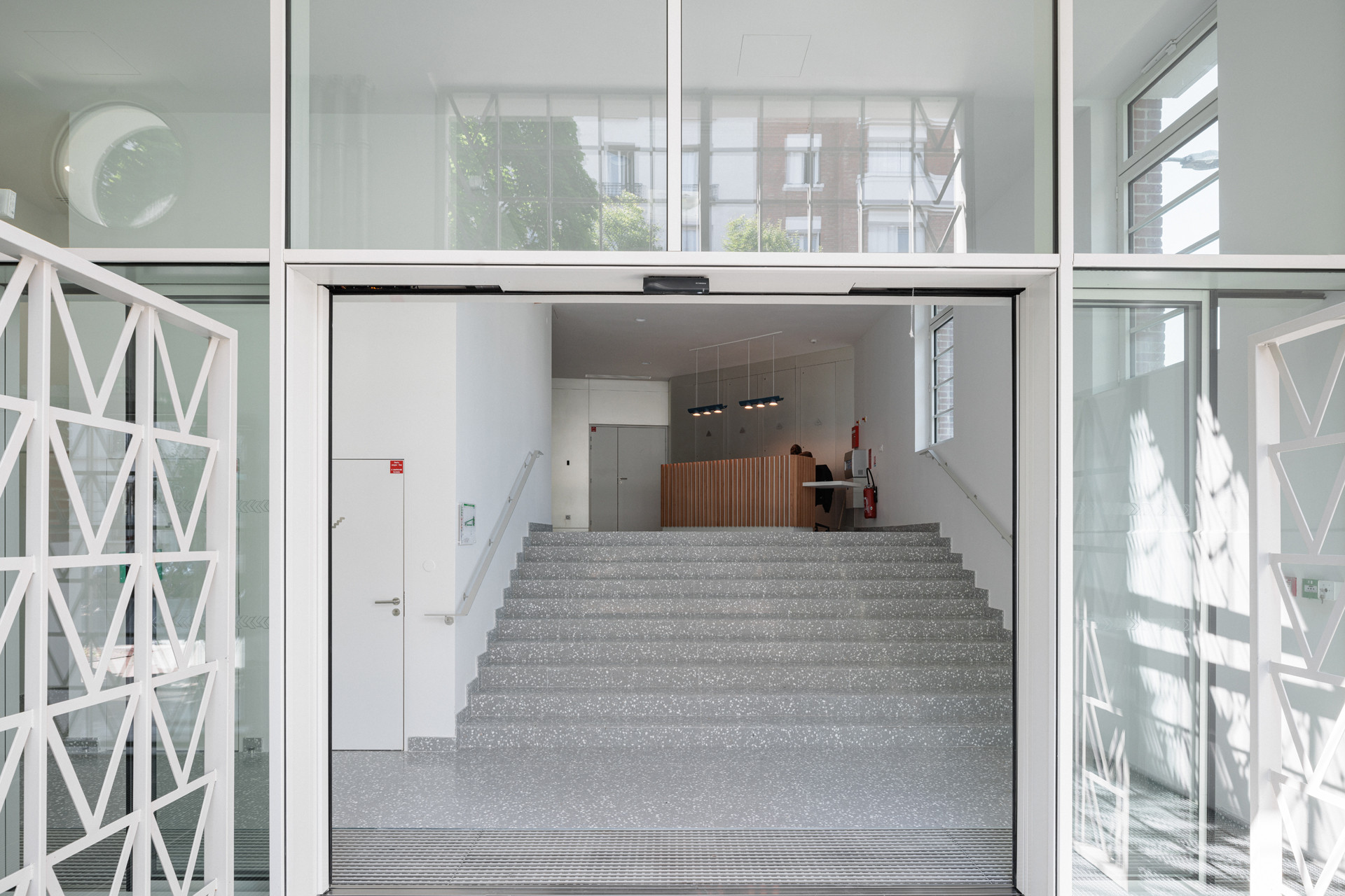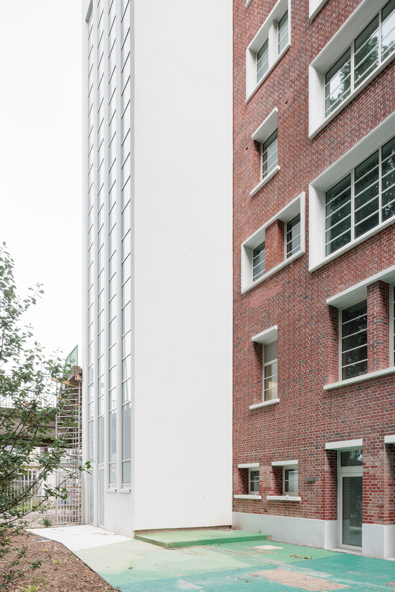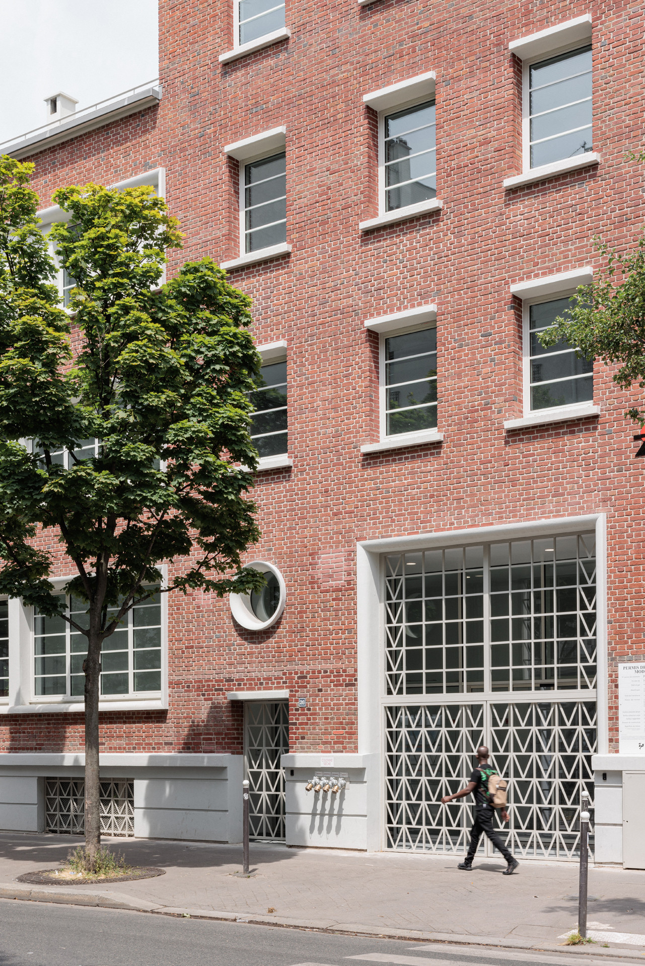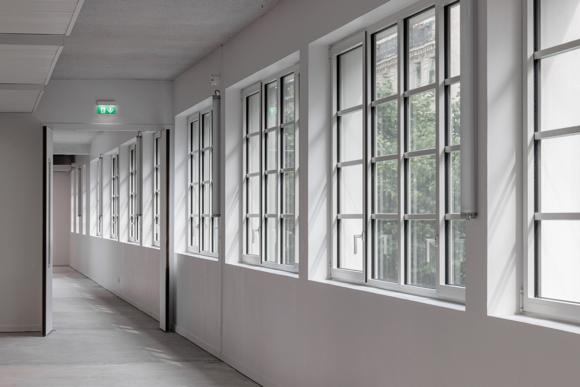 La maîtrise d’œuvre a imaginé un bâtiment restauré, aussi noble et fière qu’à ses premières heures. Sans ajout de fioriture (ni de moyens), il reprend son envergure par la seule mise en valeur des éléments qui le constituent déjà : remise en état de la brique, des cadres peints, des modénatures, reconstitution des larges châssis d’époque… Le projet architectural et technique de « bureaux en blanc » adopte la même posture : mettre en évidence les qualités existantes, réemployer, revaloriser (sols en pierre, luminaires, vasque, jardin).
