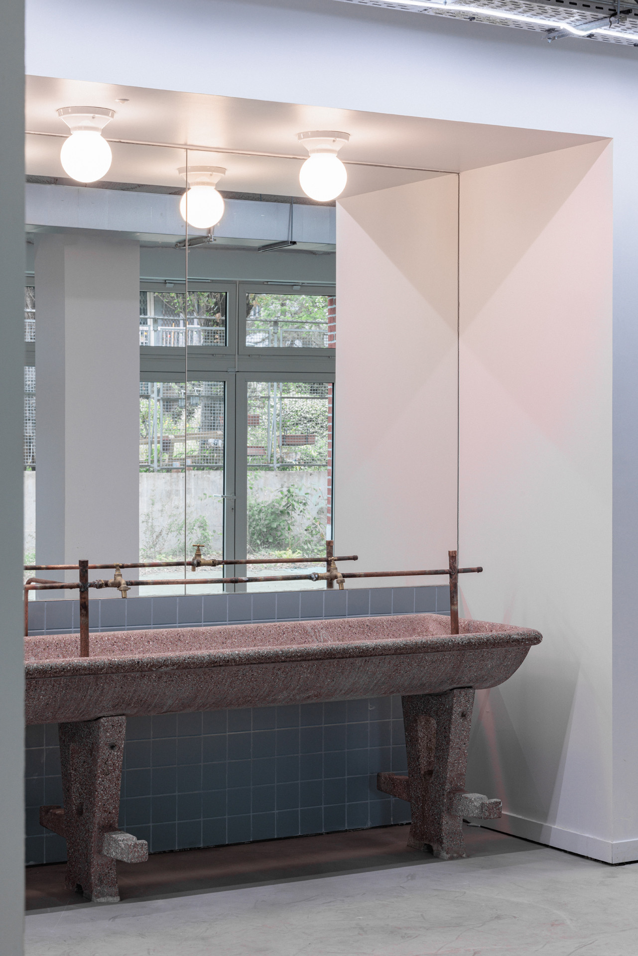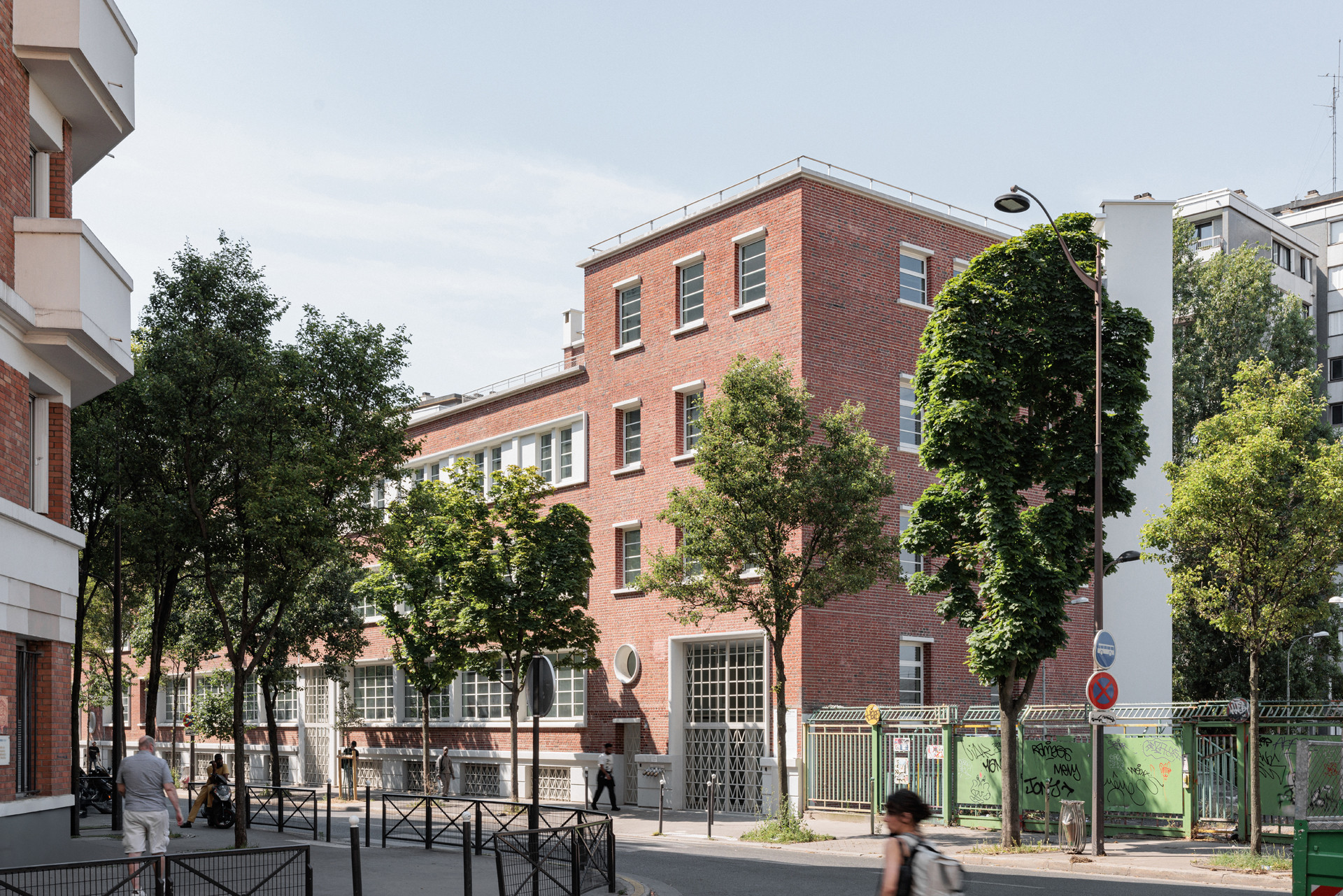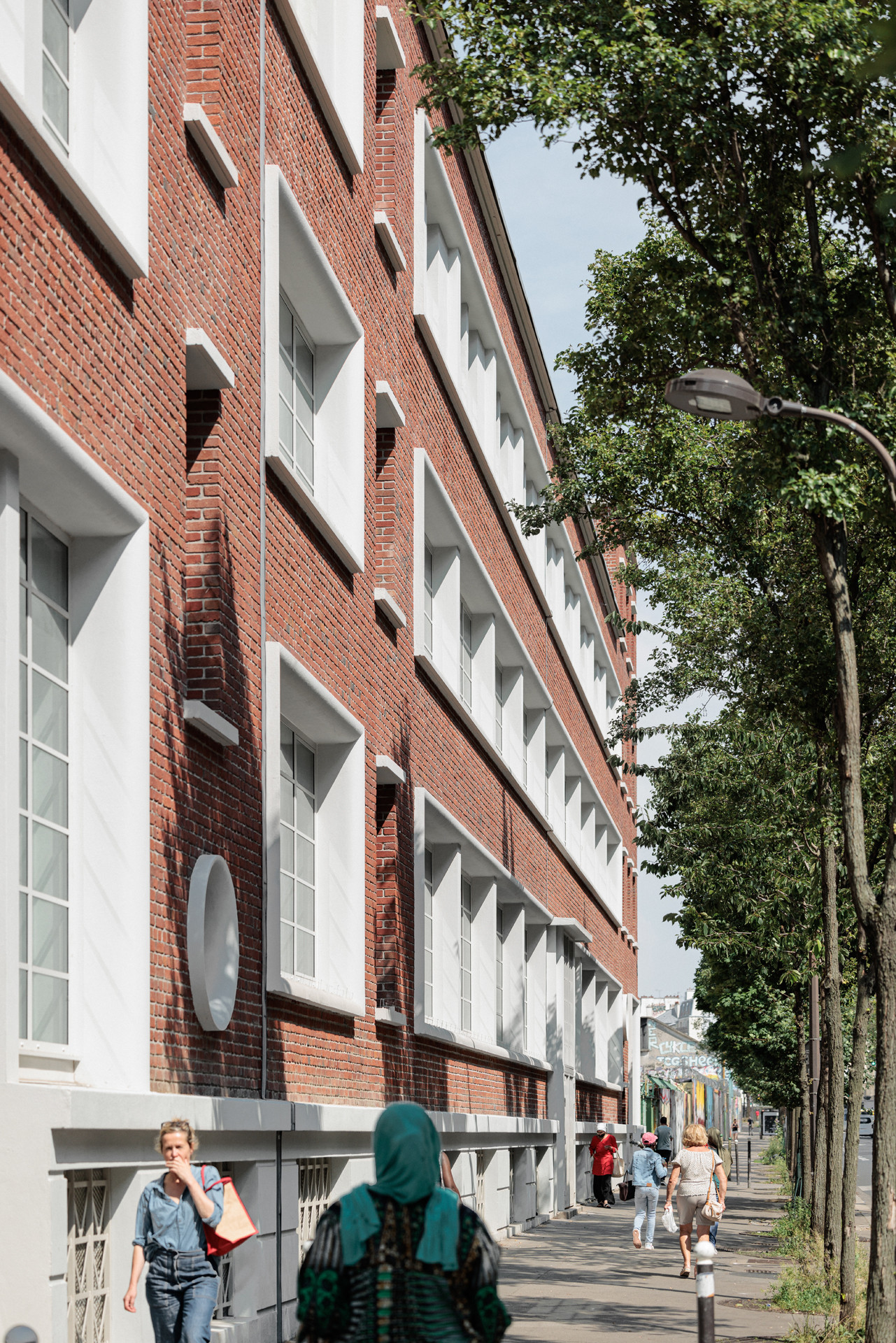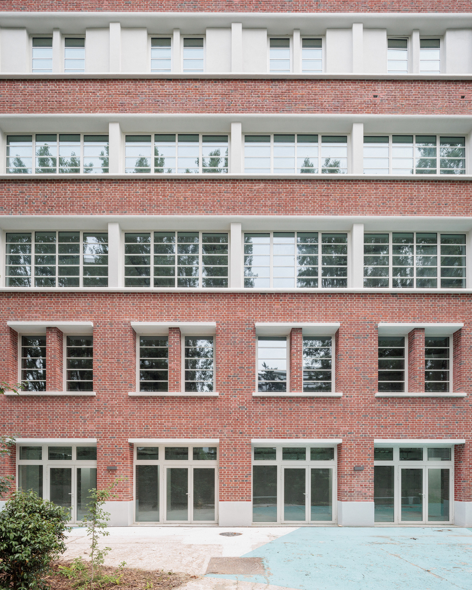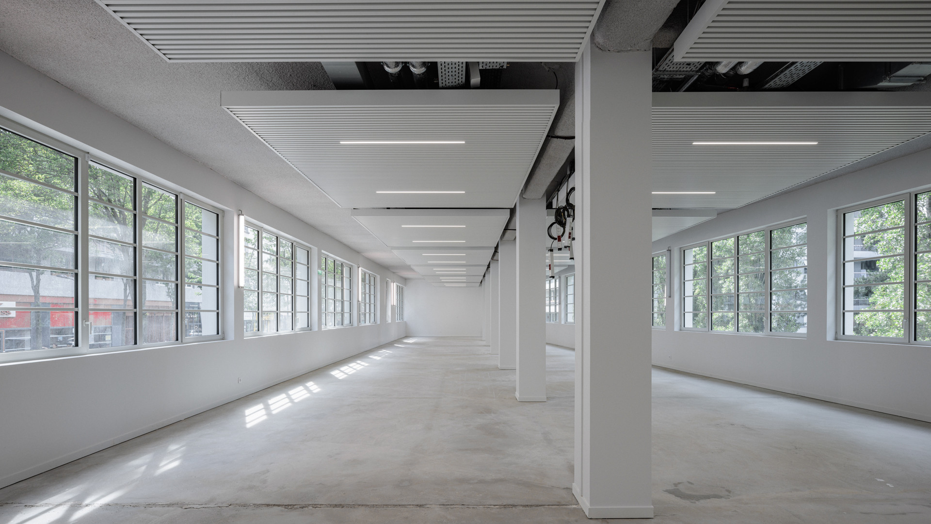 La maîtrise d’œuvre a imaginé un bâtiment restauré, aussi noble et fière qu’à ses premières heures. Sans ajout de fioriture (ni de moyens), il reprend son envergure par la seule mise en valeur des éléments qui le constituent déjà : remise en état de la brique, des cadres peints, des modénatures, reconstitution des larges châssis d’époque… Le projet architectural et technique de « bureaux en blanc » adopte la même posture : mettre en évidence les qualités existantes, réemployer, revaloriser (sols en pierre, luminaires, vasque, jardin).