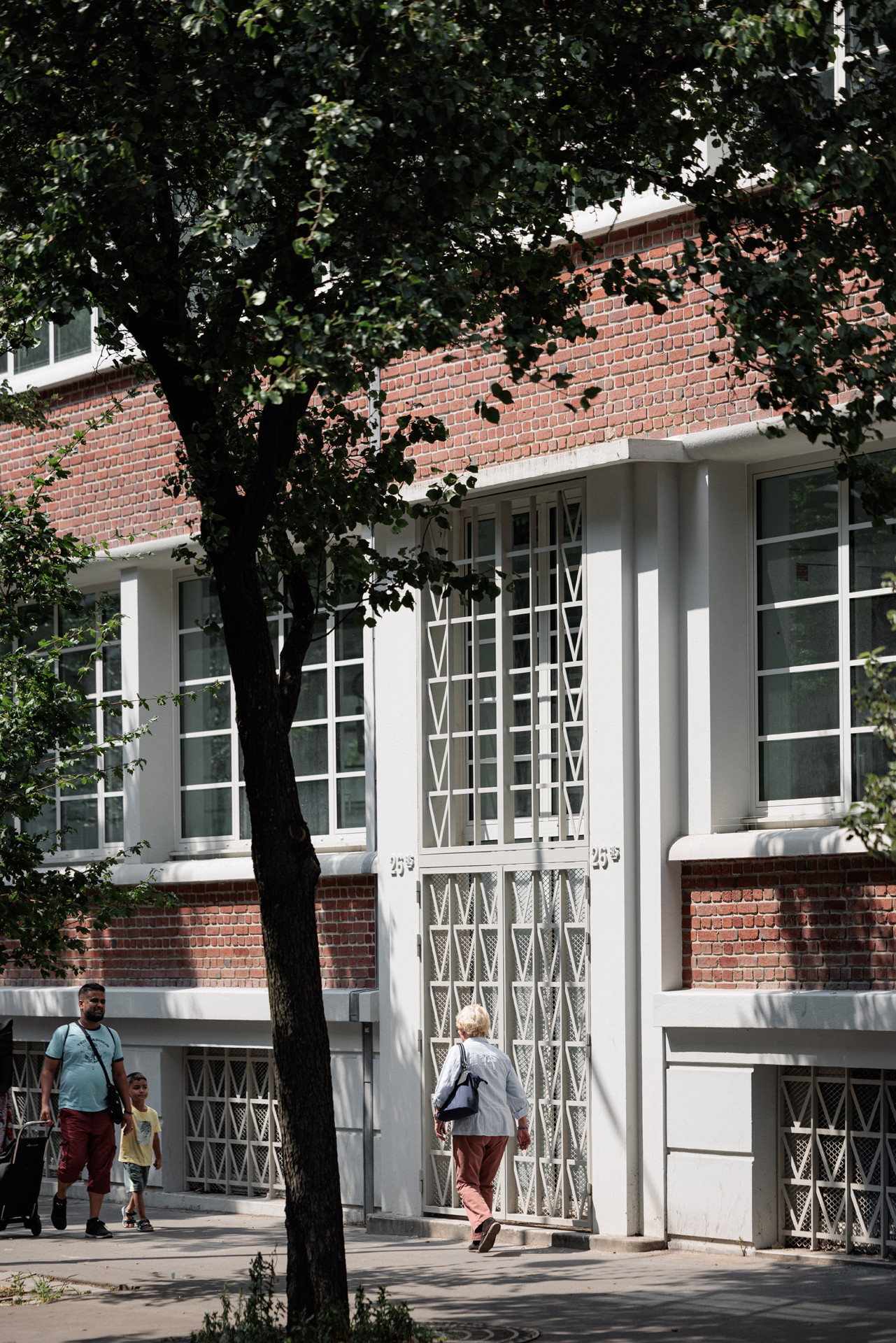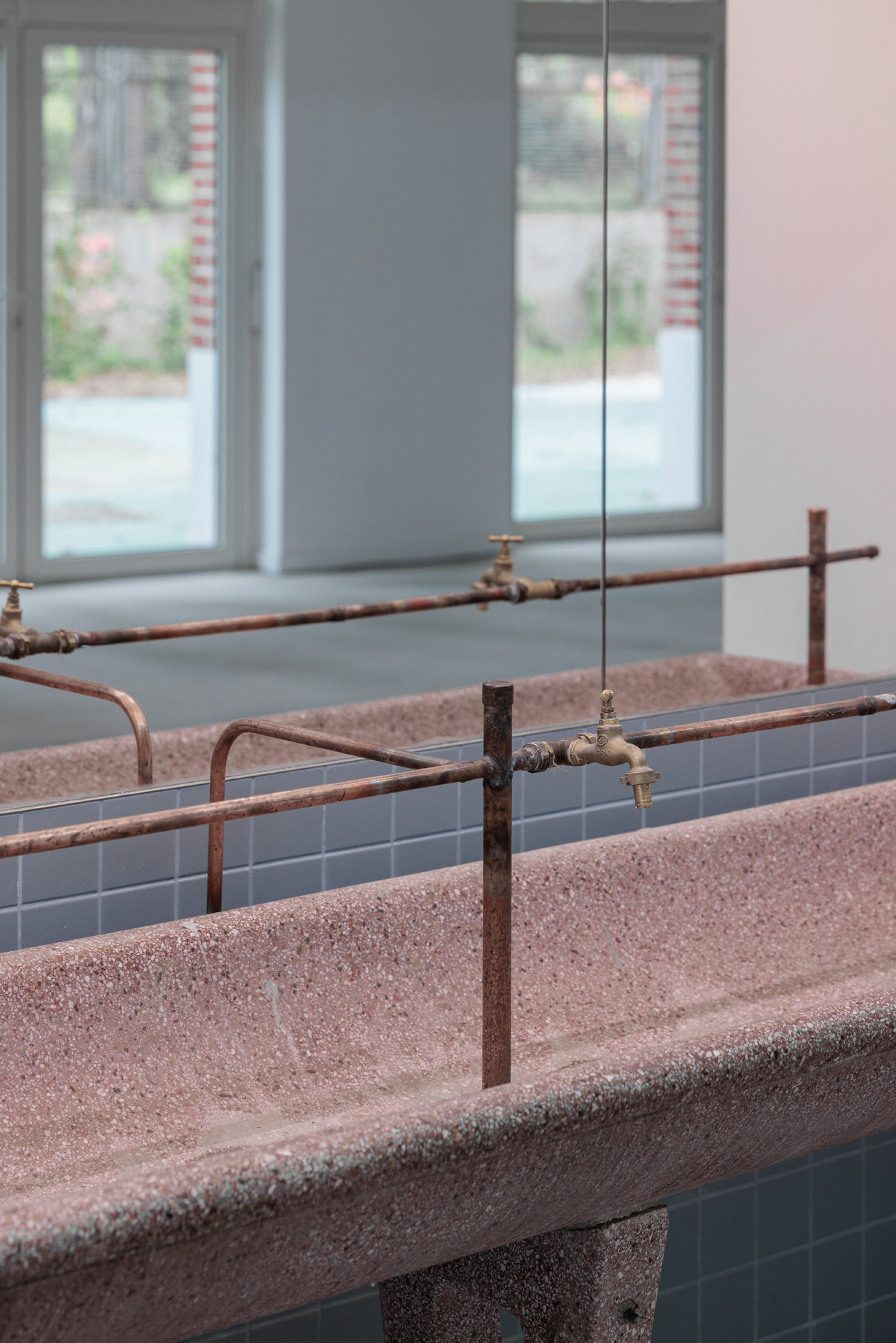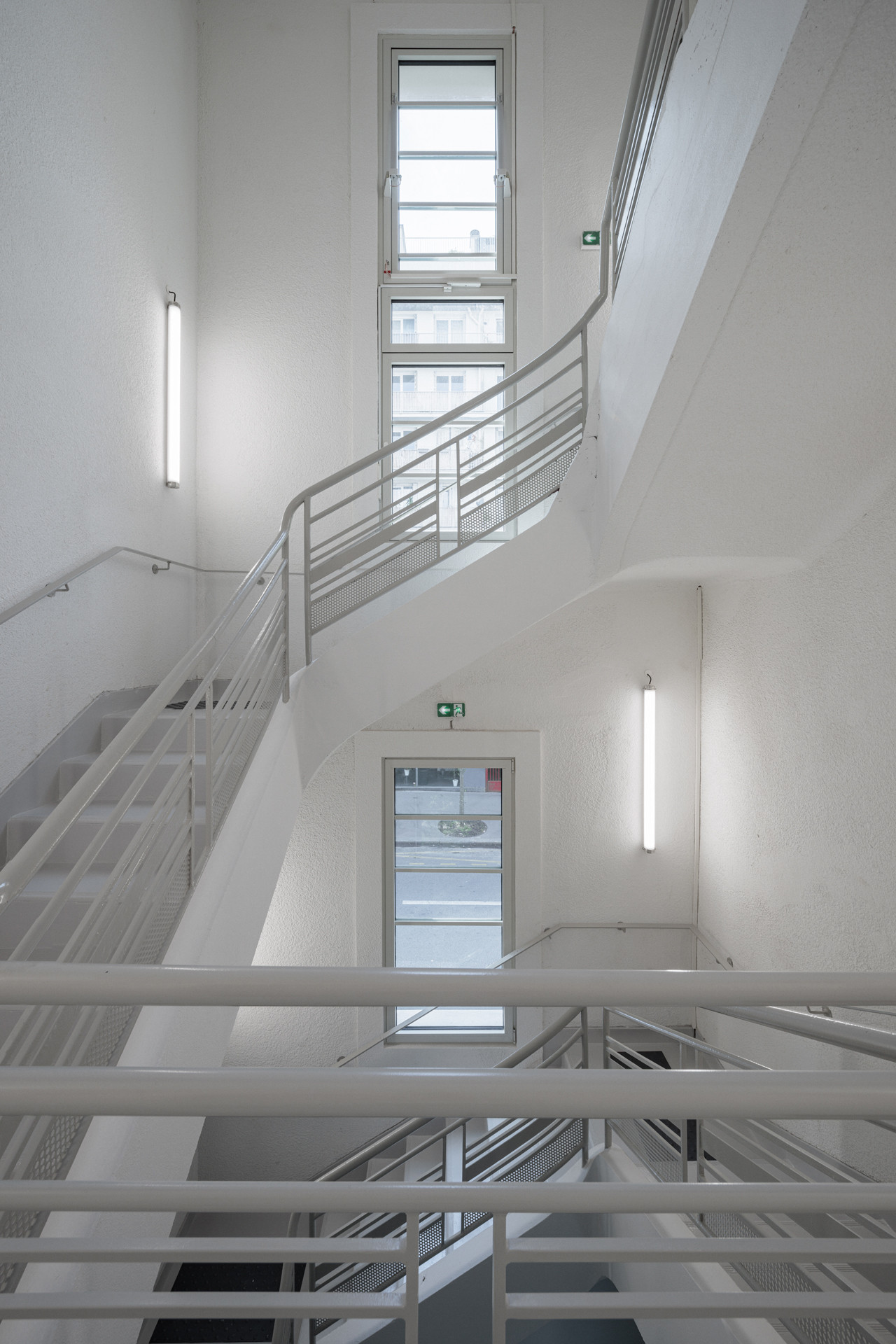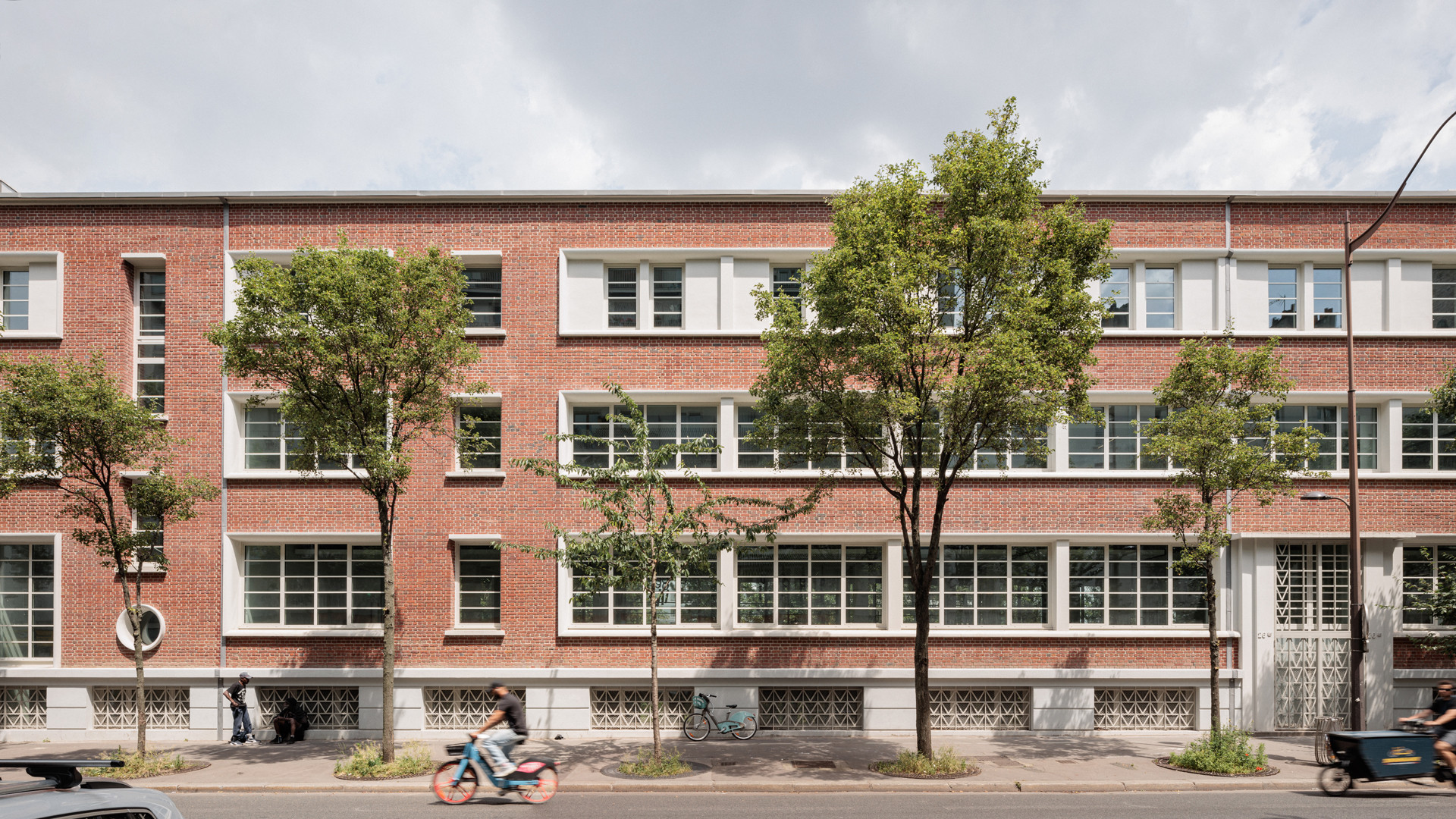 La maîtrise d’œuvre a imaginé un bâtiment restauré, aussi noble et fière qu’à ses premières heures. Sans ajout de fioriture (ni de moyens), il reprend son envergure par la seule mise en valeur des éléments qui le constituent déjà : remise en état de la brique, des cadres peints, des modénatures, reconstitution des larges châssis d’époque… Le projet architectural et technique de « bureaux en blanc » adopte la même posture : mettre en évidence les qualités existantes, réemployer, revaloriser (sols en pierre, luminaires, vasque, jardin).