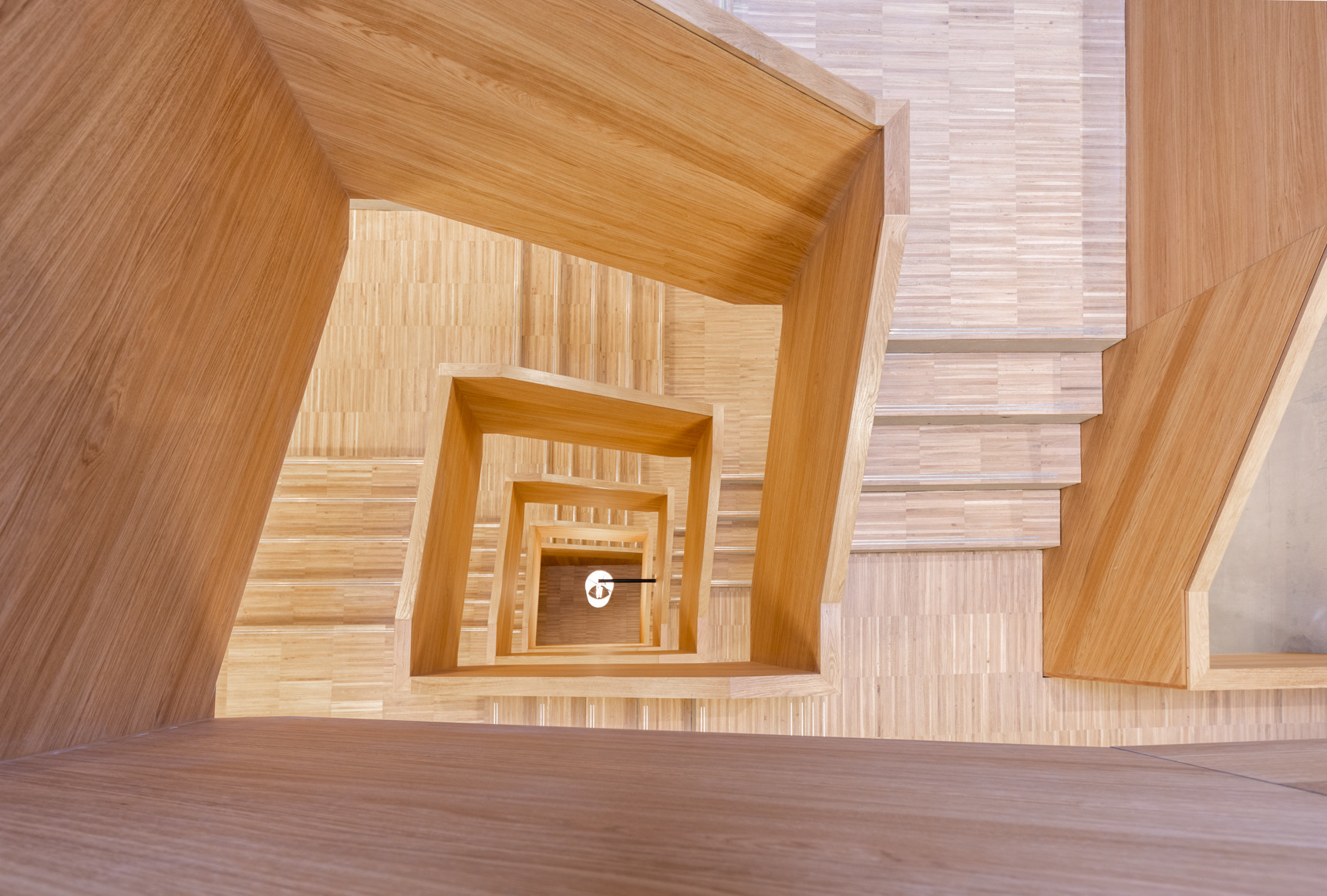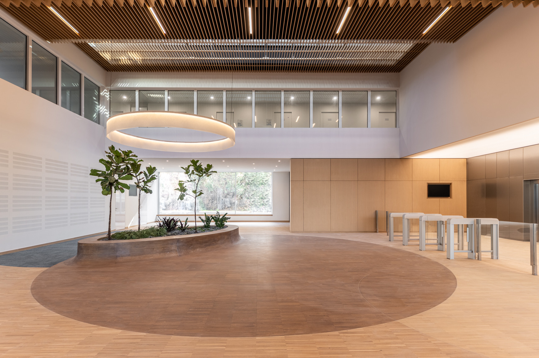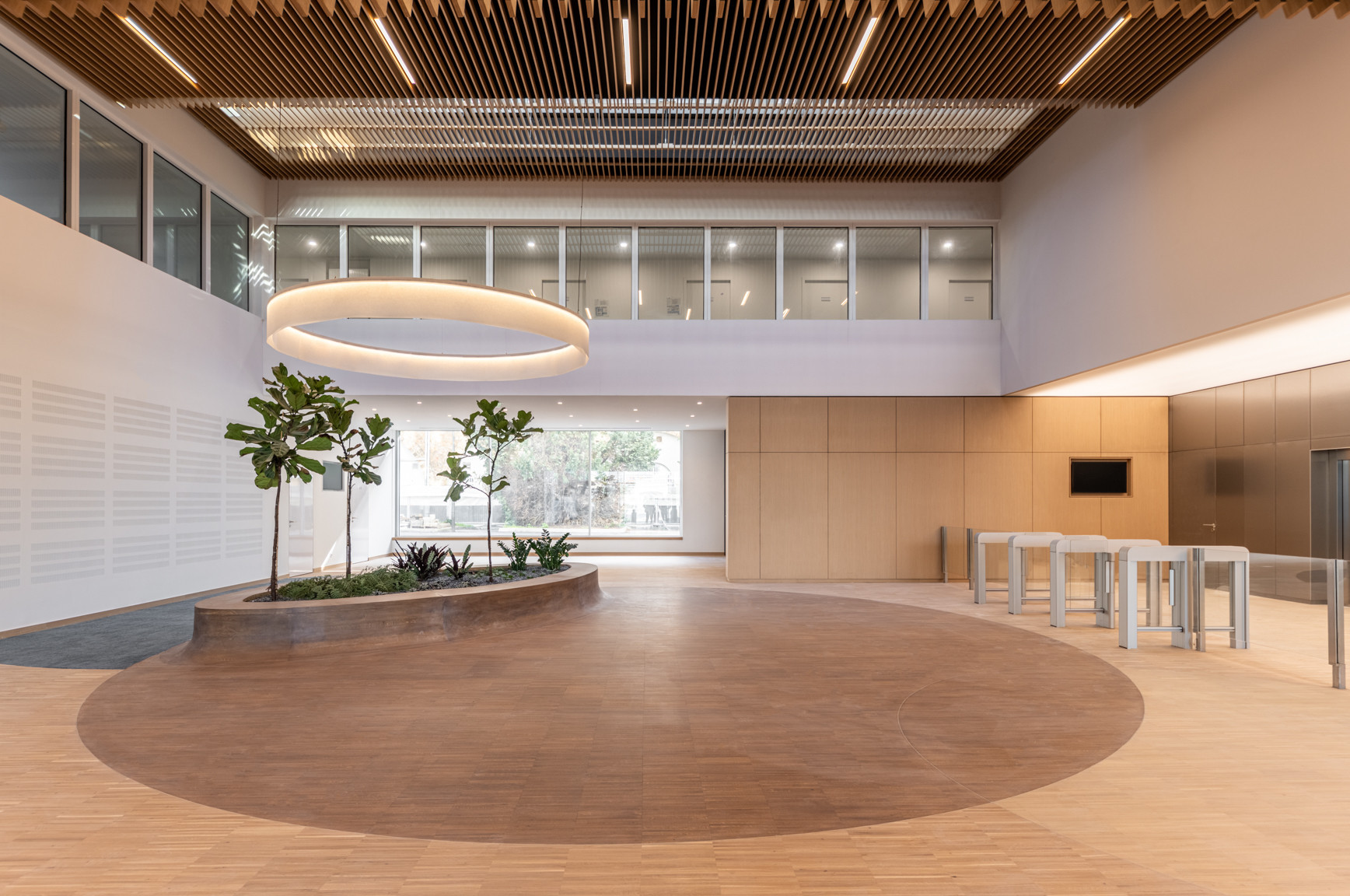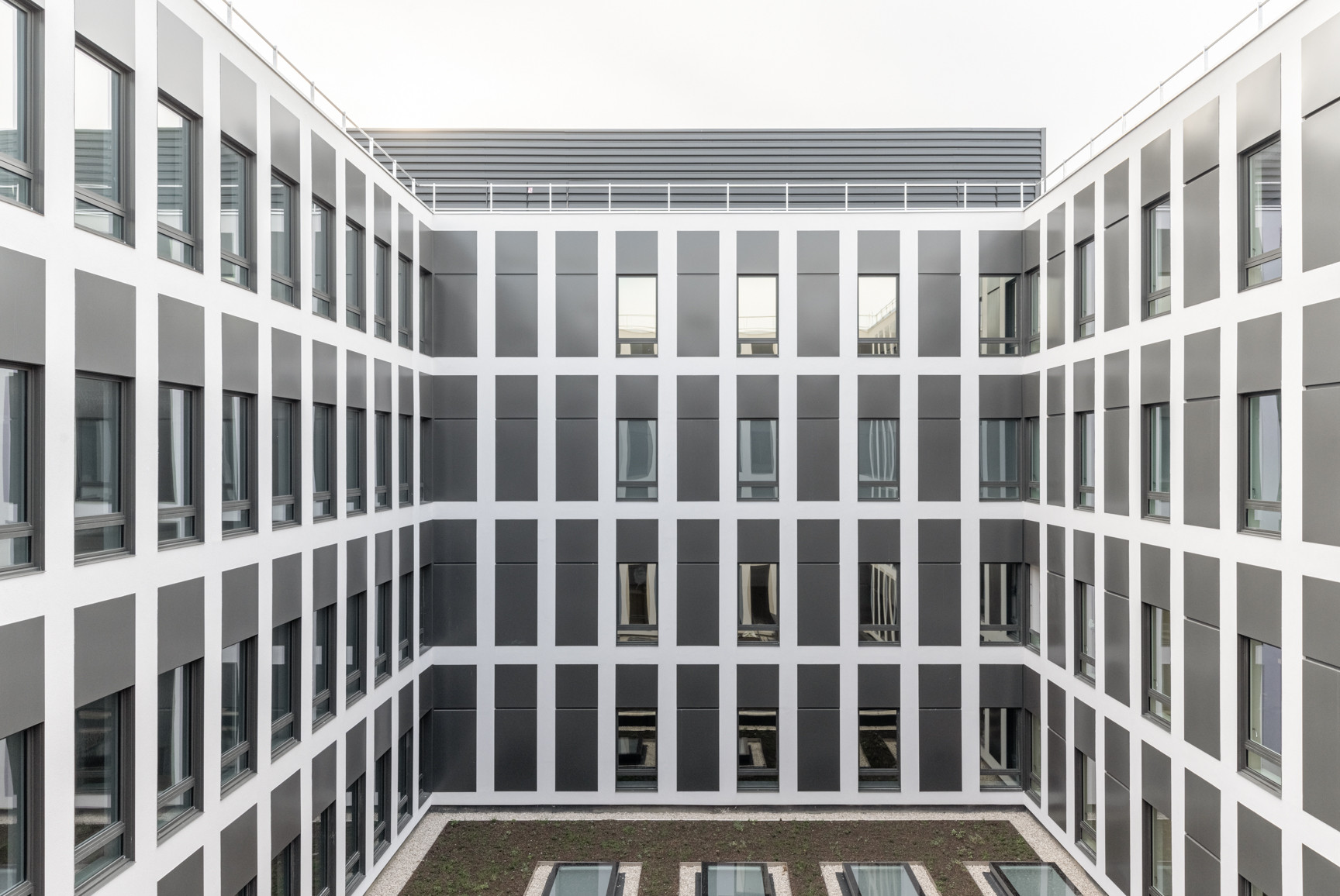 Le bâtiment se présente comme un prisme rectangulaire. Afin de rendre « habitable » l’épaisseur de ce volume, des patios ont été créés, qui permettent d’amener la lumière naturelle au cœur du bâtiment. Espaces et circulations sont ainsi éclairés en premier jour.