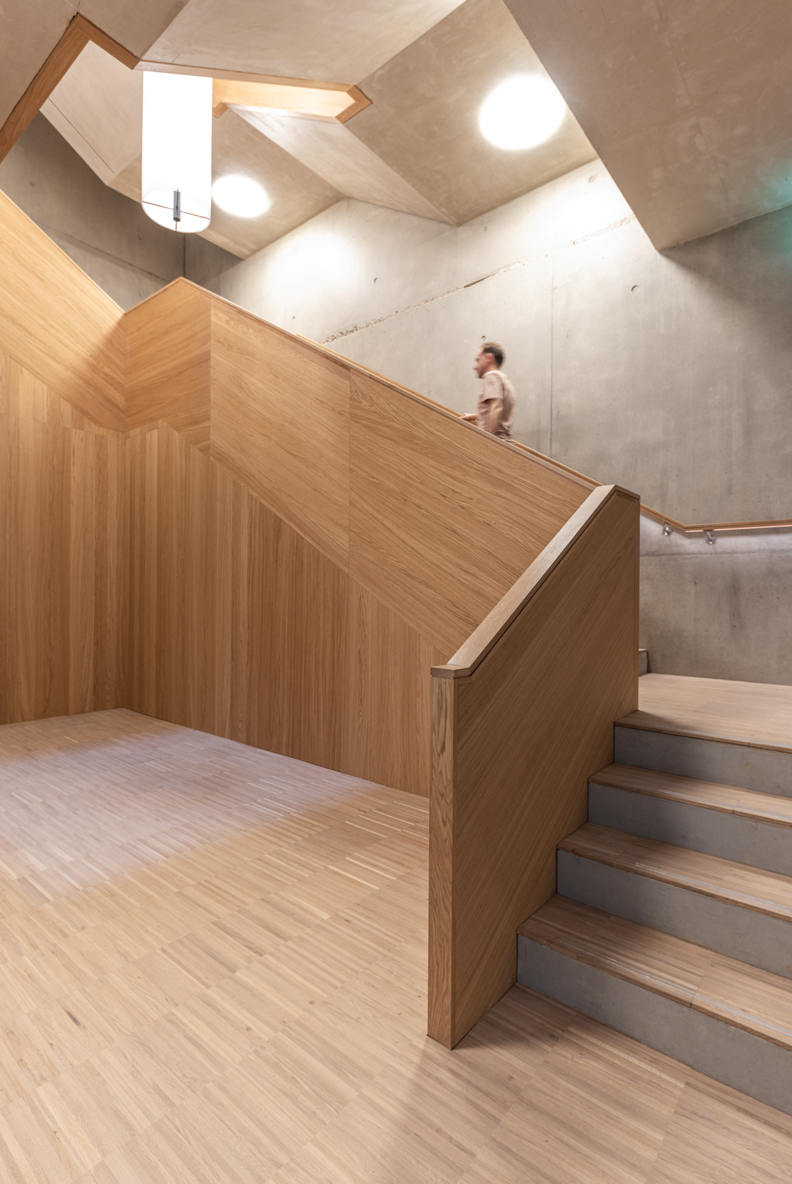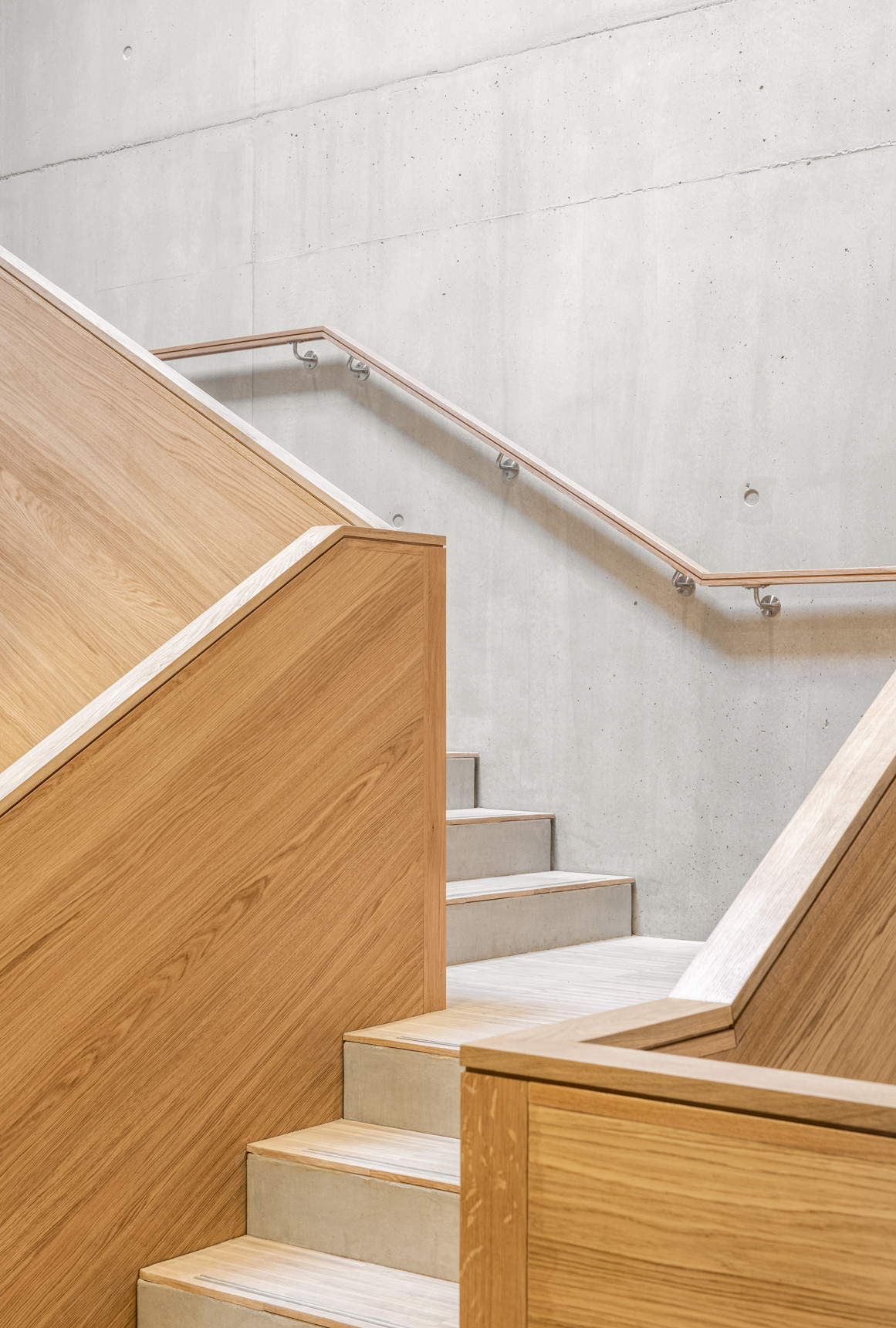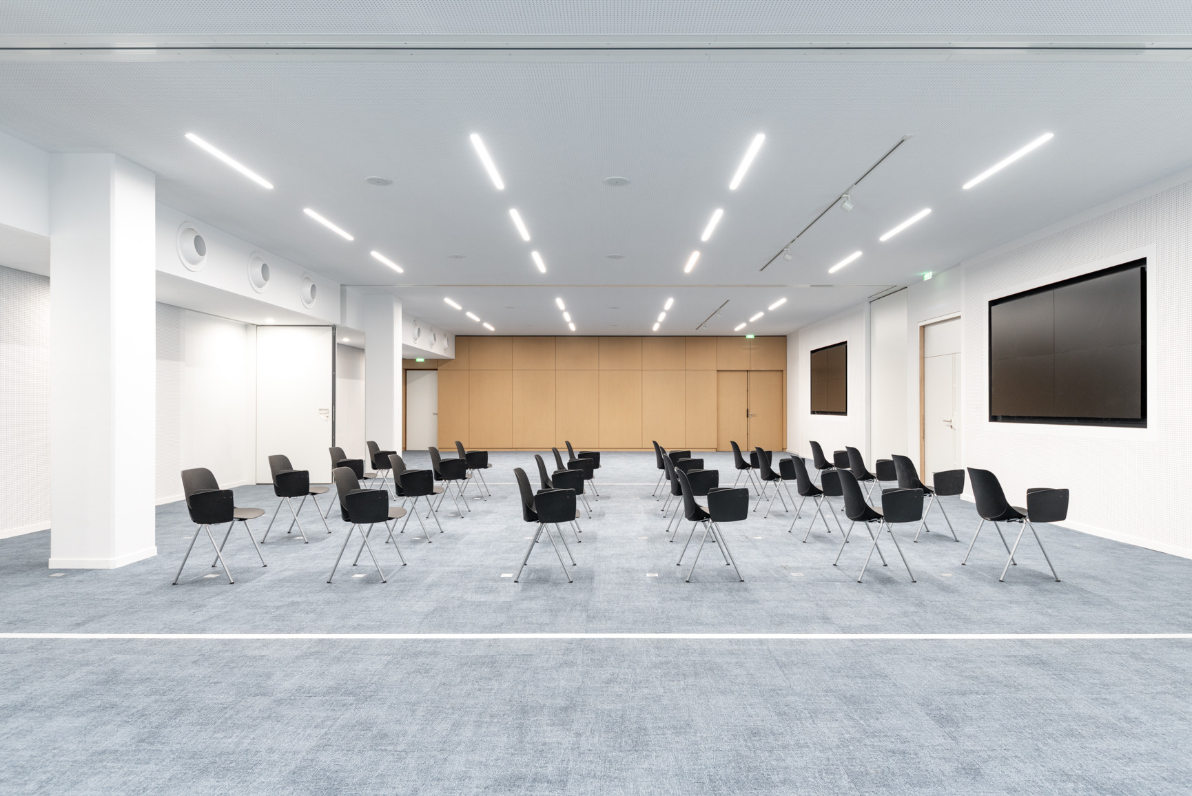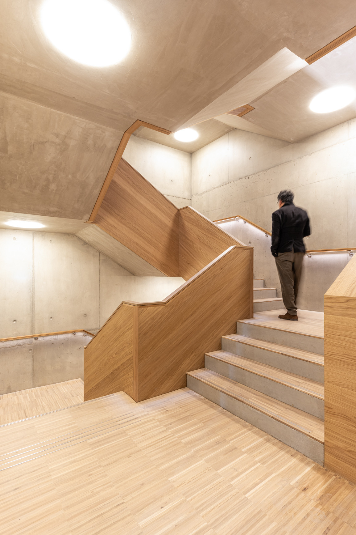 Le bâtiment se présente comme un prisme rectangulaire. Afin de rendre « habitable » l’épaisseur de ce volume, des patios ont été créés, qui permettent d’amener la lumière naturelle au cœur du bâtiment. Espaces et circulations sont ainsi éclairés en premier jour.