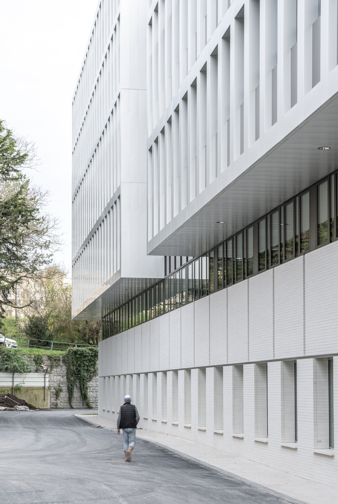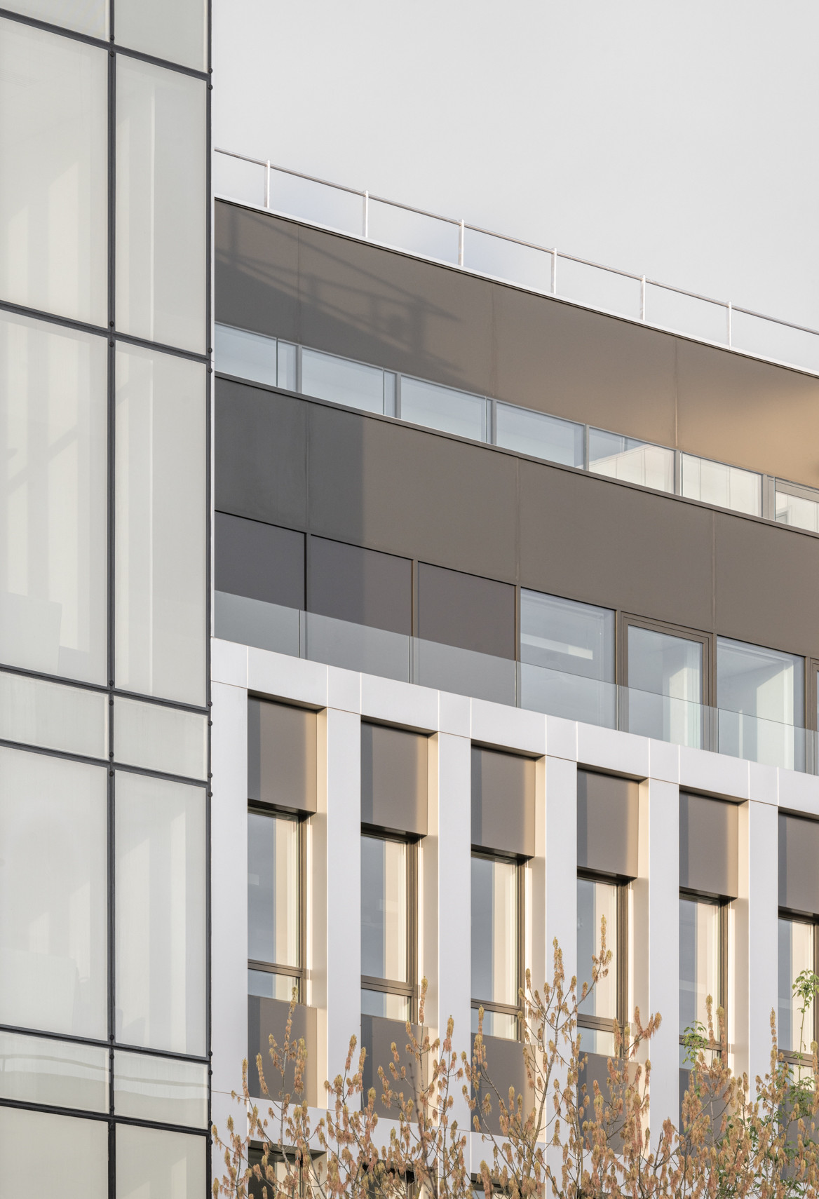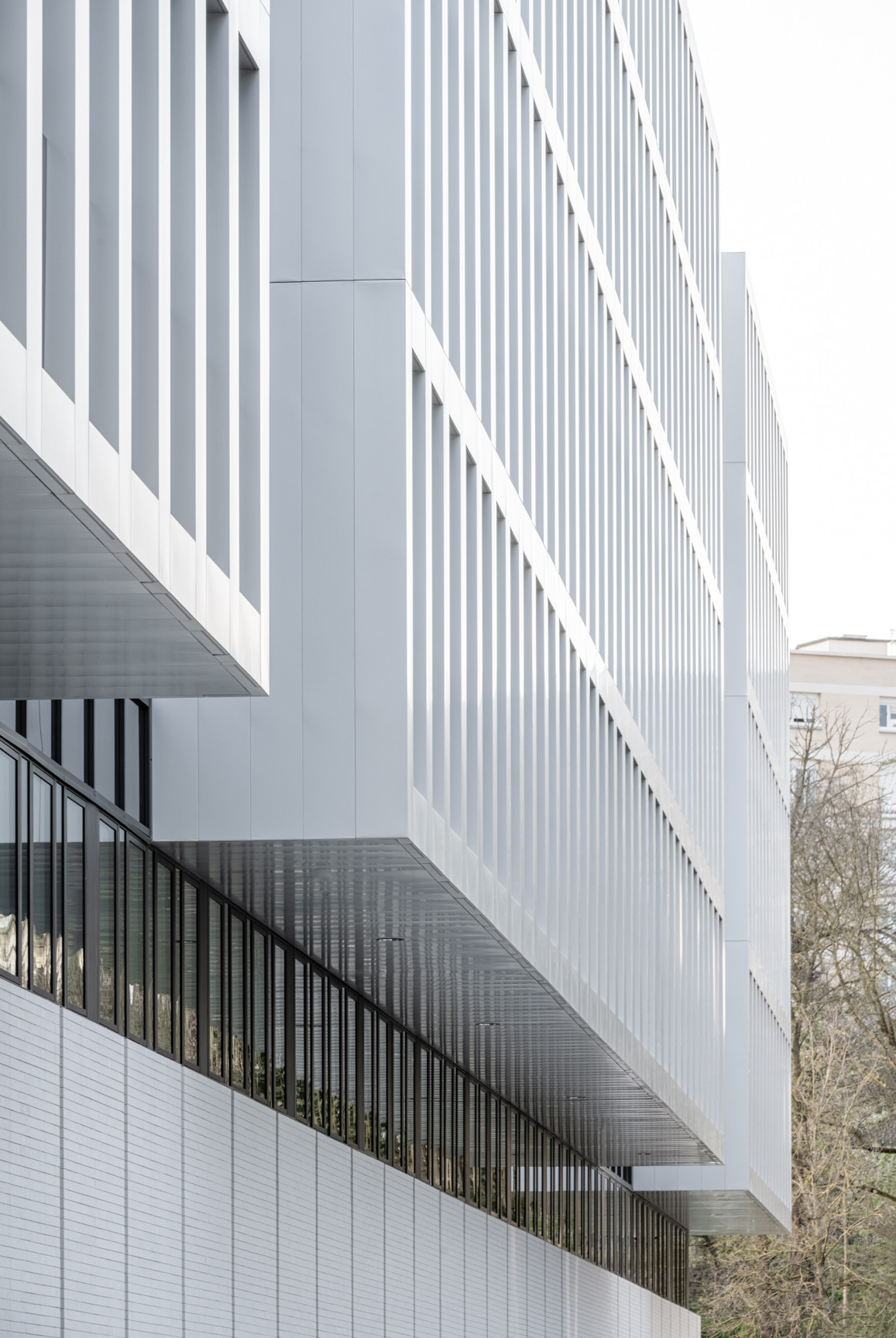 Entre le socle et les étages, une césure est créée par un bandeau vitré filant, soulignée par un décalage de nu annonçant le changement de façade. Cette disposition met en évidence la double nature du bâtiment, à la fois technique et tertiaire. Elle vise également à alléger visuellement le bâtiment en offrant de plus grandes échappées visuelles au niveau piéton, ce qui est précieux dans un environnement bâti dense.