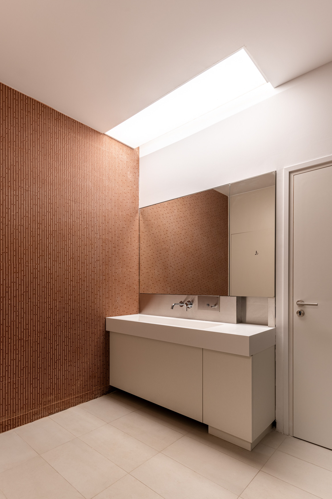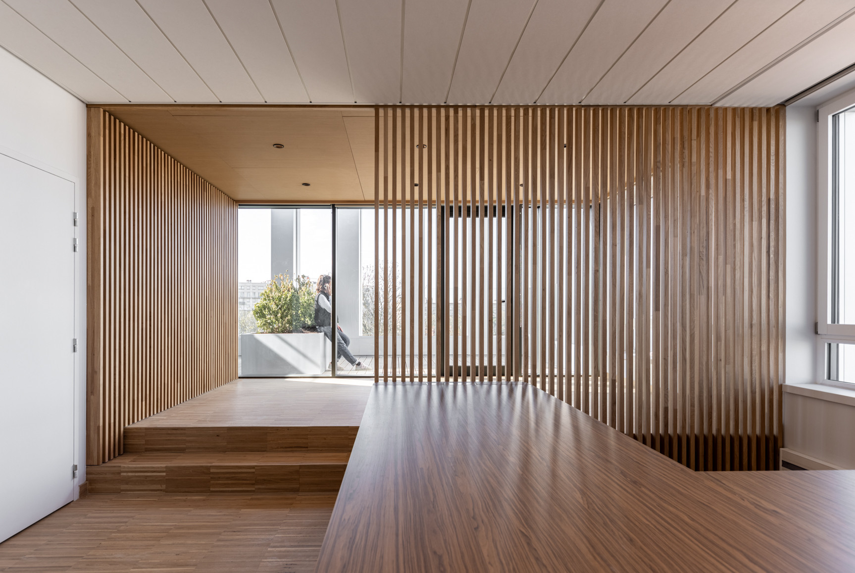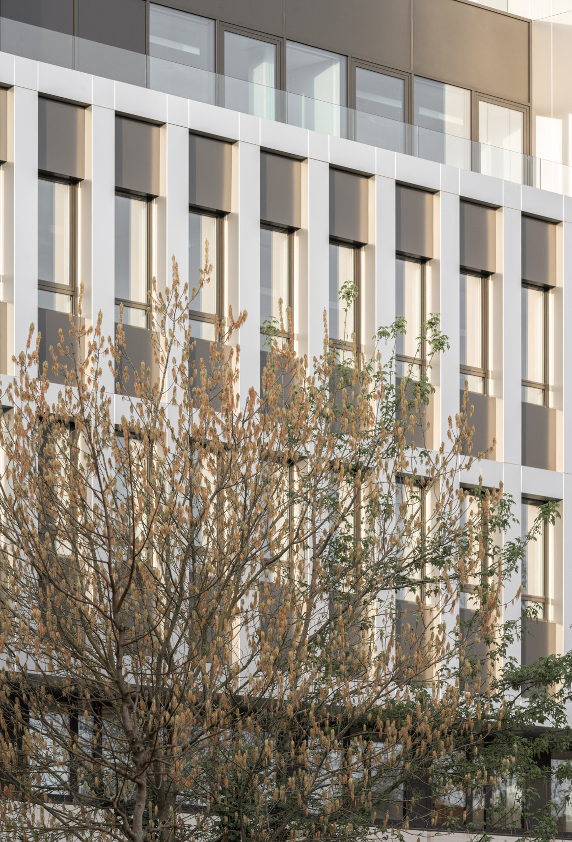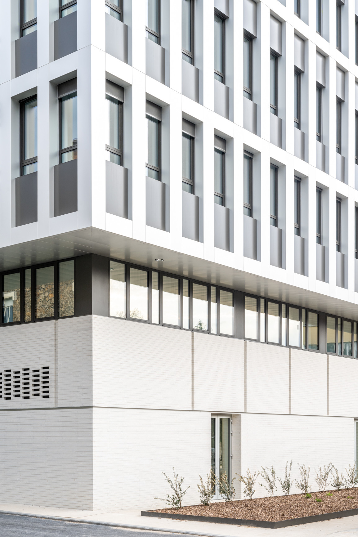 Entre le socle et les étages, une césure est créée par un bandeau vitré filant, soulignée par un décalage de nu annonçant le changement de façade. Cette disposition met en évidence la double nature du bâtiment, à la fois technique et tertiaire. Elle vise également à alléger visuellement le bâtiment en offrant de plus grandes échappées visuelles au niveau piéton, ce qui est précieux dans un environnement bâti dense.