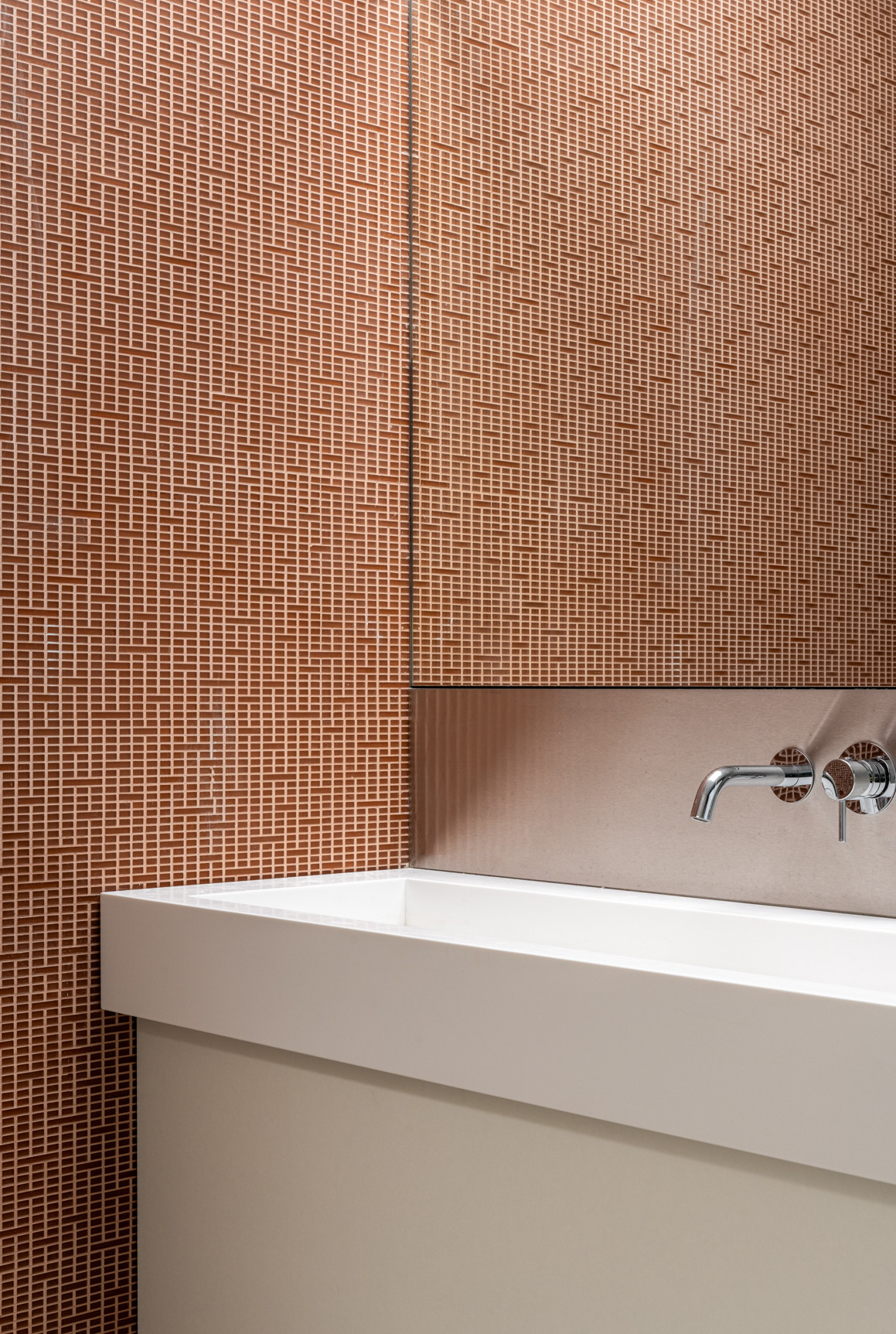 Le porche d’entrée signale fortement l’accès principal tout en magnifiant et en étendant visuellement le grand espace vert qui s’insère entre les bâtiments.